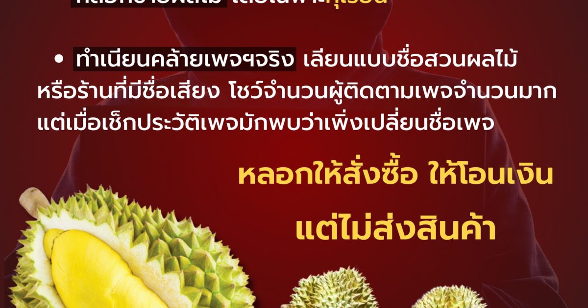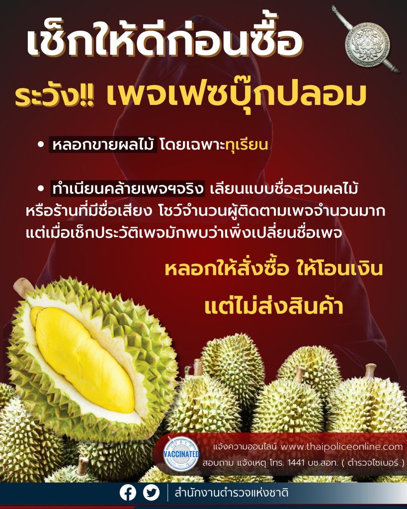 จากข้อมูลการรับแจ้งความออนไลน์ ของสำนักงานตำรวจแห่งชาติ พบว่า ตลอดเดือนพฤษภาคม 2566 มีประชาชนแจ้งความเรื่องการถูกหลอกซื้อสินค้าและบริการมากที่สุด ทั้งกรณีโอนเงินแล้วไม่ได้ของ หรือของไม่ตรงปก โดยพบว่าในช่วงนี้ “ผลไม้” โดยเฉพาะ “ทุเรียน” เป็นสินค้าที่มิจฉาชีพทางออนไลน์หลอกขาย และมีผู้ตกเป็นเหยื่อมากที่สุด